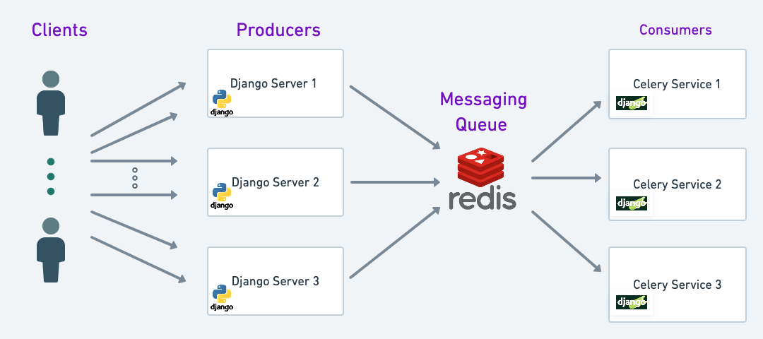 - Consumers - Celery services will pick tasks from the Redis queue and execute them. When a task is picked by any celery service, then the given task is marked as acknowledged so that no other celery picks it, after it is successfully executed then it will send a signal to Redis to delete the given task so that it is no more executed. If the celery task fails to execute then it is pushed back to the queue (you need to add do some additional configuration for this feature)