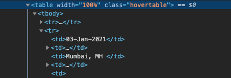 Once we load the response now we can check the cheerio library syntax to find the appropriate functionality as per our requirements. For us, we need to find the list of elements that are present inside the <table class="hovertable"> tag having <tbody> tag.