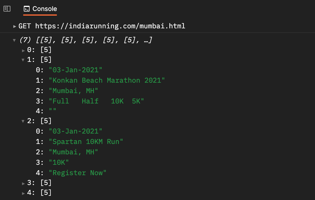 We can use the Postman test script to write a scrapper using cheerio. Test scripts are executed on the server-side and not on your browser. In the following snippet, I have a small scraper to get all the marathon events listed on the website https://indiarunning.com/mumbai.html and then console the result.
